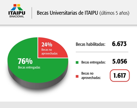 Asimismo, se pudo chequear que de las 6.673 becas lanzadas en los últimos 5 años por la ITAIPU Binacional, 1.617 cupos no fueron cubiertos. Es decir, se desaprovechó el 24% del total puesto a disposición de los alumnos. Por tanto, solo el 76% fue adjudicado tras el proceso de admisión, que incluye, en primer lugar, el examen de conocimiento en Lengua Castellana y Matemática, y luego las entrevistas socioeconómicas.
