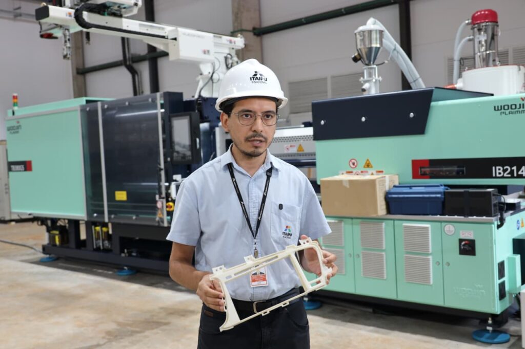 El ingeniero Luis López, de la Asesoría de Movilidad Eléctrica Sostenible de ITAIPU, explicó que ya se encuentran instaladas tres máquinas inyectoras de plástico, de 120, 240 y 380 toneladas. Las mismas serán utilizadas para la fabricación de componentes destinados a vehículos y autopartes.