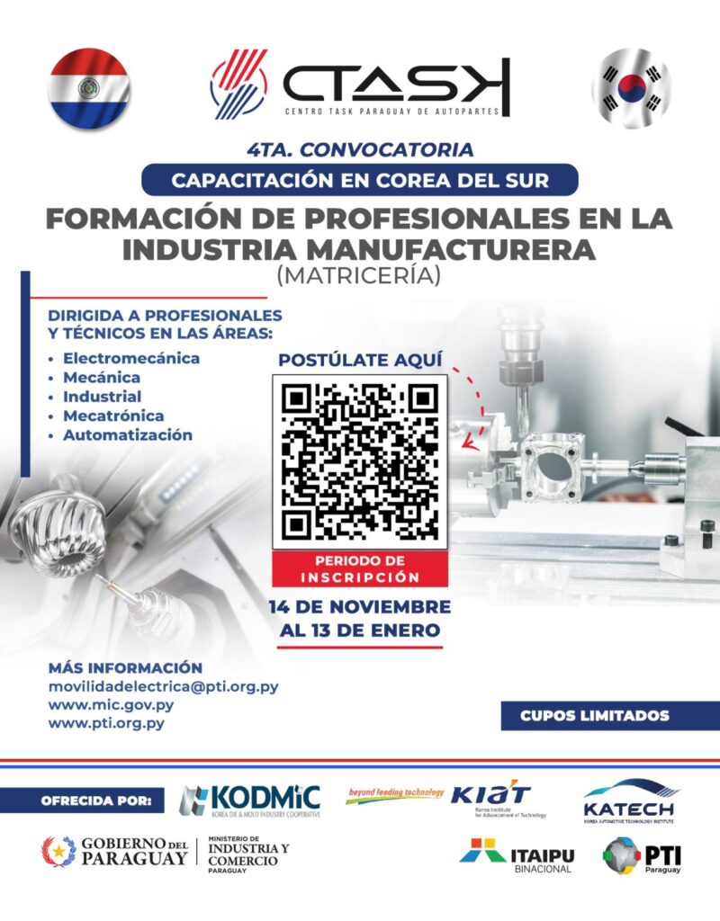 La convocatoria, que estará vigente hasta el 13 de enero de 2026, busca seleccionar a 10 profesionales y técnicos para ayudar a impulsar el desarrollo de moldes y piezas en Paraguay, con enfoque en la industria autopartista y electromovilidad. La iniciativa, que es llevada adelante por los gobiernos paraguayo y surcoreano, cuenta con el apoyo de ITAIPU, del Ministerio de Industria y Comercio (MIC); Instituto Tecnológico Automotriz de Corea del Sur (Katech); y del Parque Tecnológico ITAIPU – Paraguay (PTI-PY).