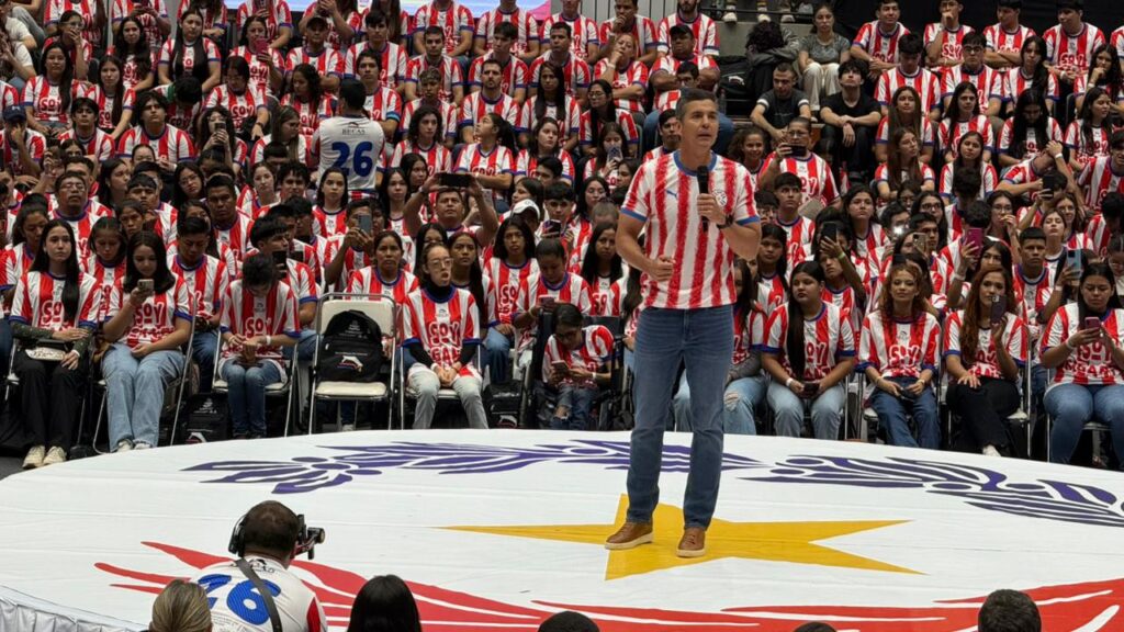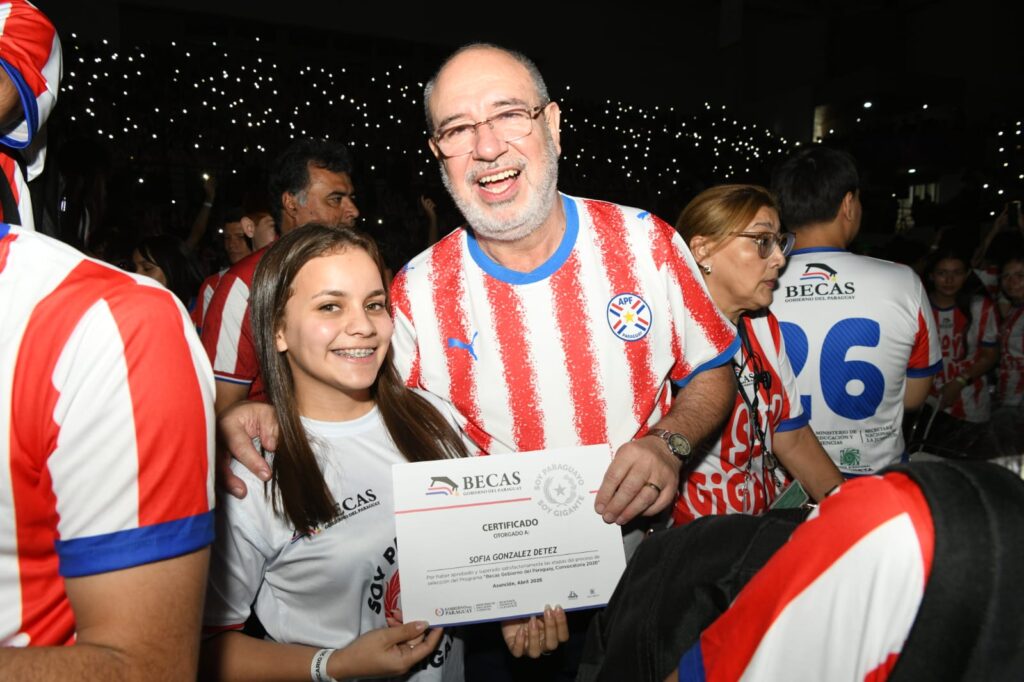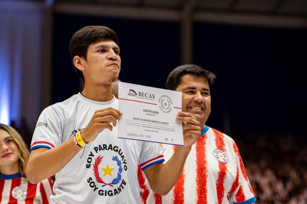 El Programa Becas Gobierno del Paraguay entregó este sábado, 11 de abril, los certificados de adjudicación de becas a los seleccionados de la Convocatoria 2026. El acto, desarrollado en el polideportivo Arena de la Secretaría Nacional de Deportes (SND), fue encabezado por el presidente de la República, Santiago Peña, quien estuvo acompañado del vicepresidente Pedro Alliana; del director general paraguayo de ITAIPU, Justo Zacarías Irún; entre otras autoridades nacionales. En esta tercera edición, son beneficiarios alrededor de 7.600 jóvenes en todo el país, tras la ampliación de cupos por instrucción del jefe de Estado.