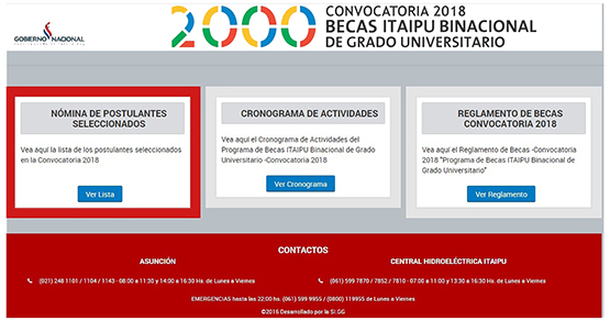 La ITAIPU Binacional informa que la Nómina Oficial de Postulantes seleccionados de la Convocatoria 2018 para las Becas ITAIPU – de Grado Universitario, conforme a los criterios, puntuaciones y procedimientos establecidos en el Reglamento de Becas 2018, se encuentra publicada y disponible en la página web https://apps.itaipu.gov.py/SGBC/