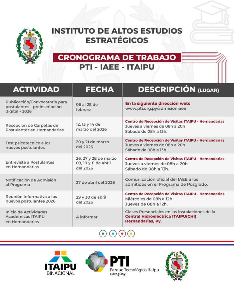 ITAIPU Binacional recuerda que se encuentra abierto el periodo de preinscripción 2026 para programas de posgrado del Instituto de Altos Estudios Estratégicos (IAEE) en el departamento de Alto Paraná. El plazo para completar el trámite vence este sábado, 28 de febrero. La información completa de los programas y el formulario de preinscripción se encuentran disponibles en el sitio www.pti.org.py/iaee.