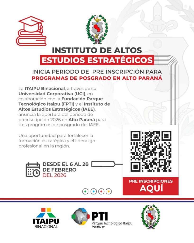 ITAIPU, a través de su Universidad Corporativa (UCI), en coordinación con la FPTI-PY y el IAEE, anunció la reapertura del período de preinscripción 2026 en Alto Paraná para los interesados en cursar tres programas de posgrado en las instalaciones de la CHI.