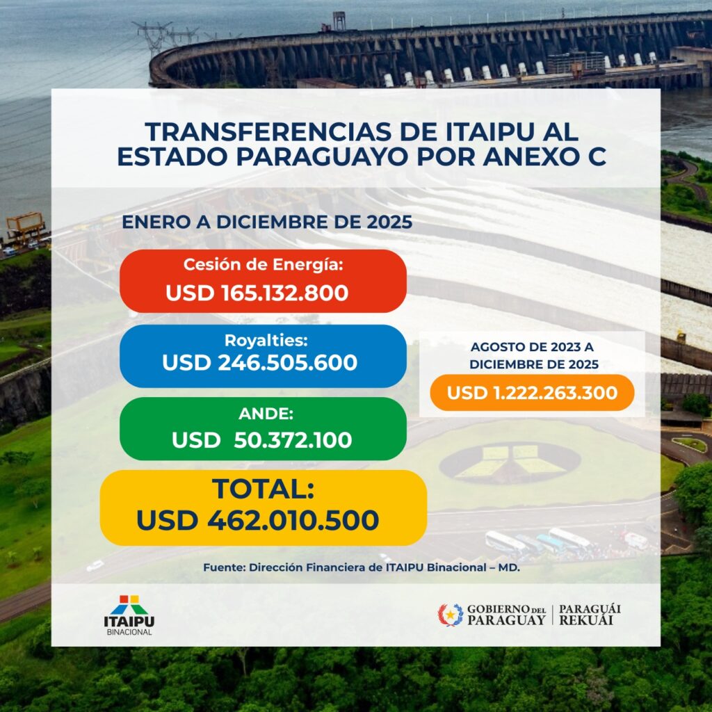 De enero a diciembre de 2025, ITAIPU Binacional transfirió un total de USD 462 millones al Estado paraguayo, en concepto de royalties, compensación por cesión de energía y pagos a la Administración Nacional de Electricidad (ANDE). Estos desembolsos, contemplados en el Anexo C del Tratado, son fundamentales para que municipios, gobernaciones y la empresa estatal puedan llevar adelante obras en beneficio de la población.