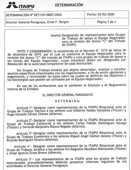 El director general paraguayo de ITAIPU, Ernst Bergen, designó a los representantes de la Entidad Binacional, Lado Paraguayo, que integrarán los cuatro Grupos de Trabajo creados por el Poder Ejecutivo para apoyar las tareas del Equipo Negociador para la Revisión del Anexo C del Tratado de ITAIPU, dando así cumplimiento a lo establecido en el Decreto N° 3.173 del 30 de diciembre de 2019.