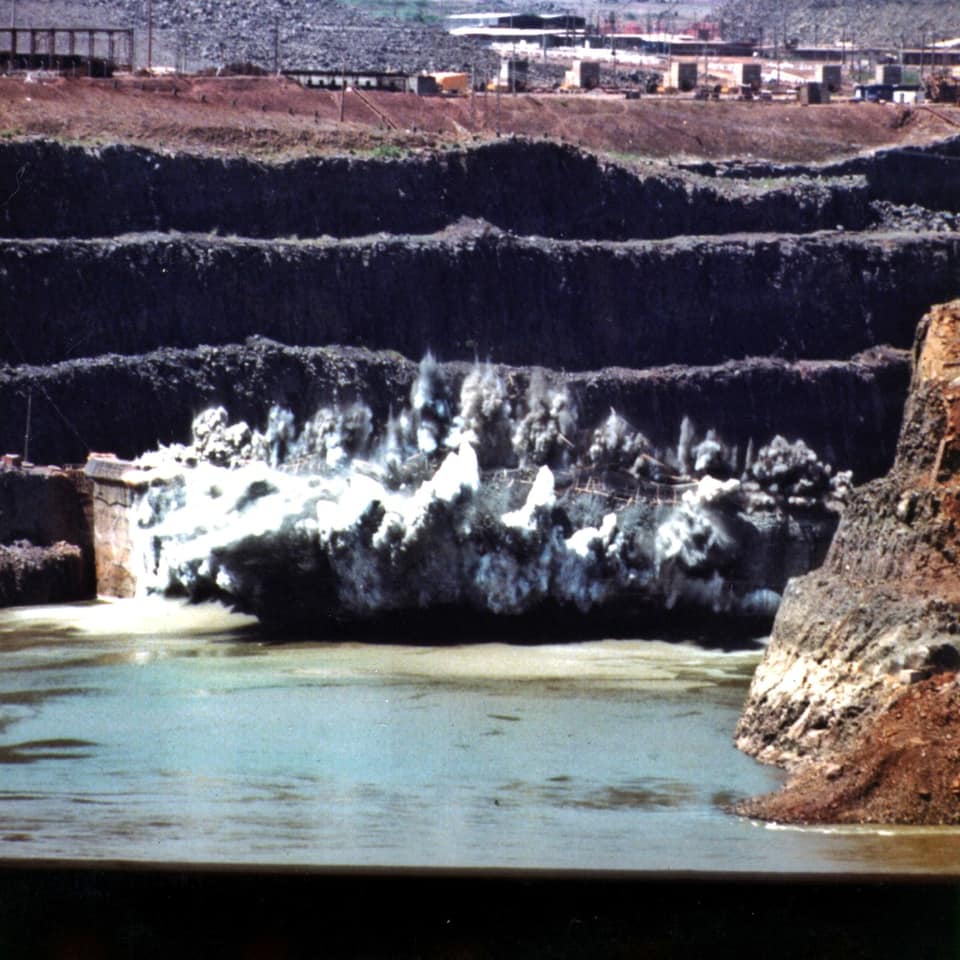 Los datos históricos indican que el 20 de octubre de 1978, las dos ataguías arqueadas fueron demolidas por explosiones simultáneas. Su demolición tomó 3 segundos y la explosión comenzó desde el centro de los arcos, que pronto se extendió a las vigas. Se volaron grupos de 3 orificios a intervalos de 20 milisegundos (milímetros por segundo, mm/s), mejorando así la fragmentación, reduciendo la expulsión de fragmentos y minimizando la intensidad de las vibraciones causadas por la explosión.