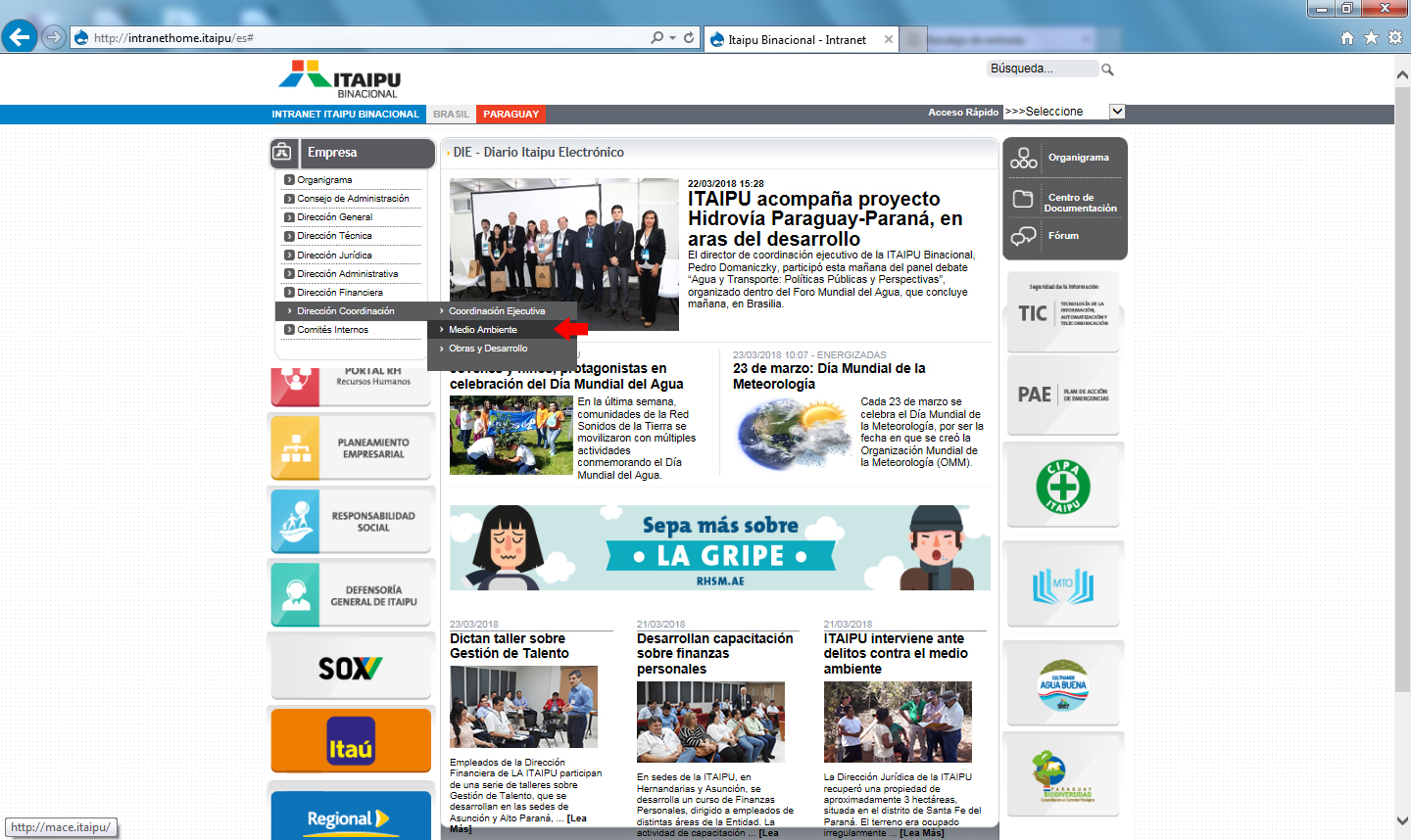Desde de la página de INTRANET acceder a la sección "Empresa", luego "Dirección de Coordinación" a continuación seleccionar "Medio Ambiente".