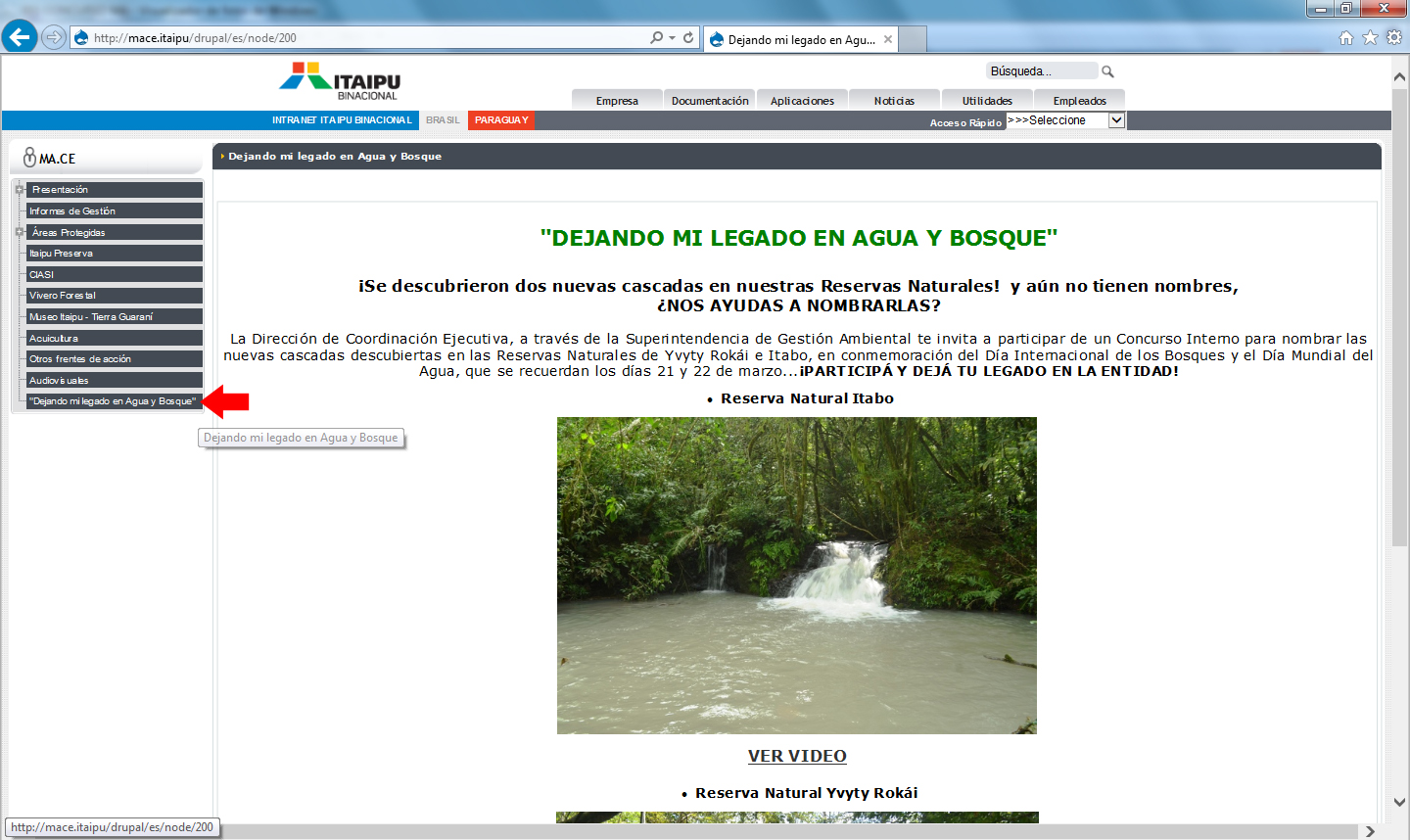 Para participar del concurso interno de nombres de nuevas cascadas descubiertas en las reservas Yvyty Rokái e Itabó, los empleados interesados deben ingresar al portal de la Superintendencia de Gestión Ambiental, en la Intranet, en el sitio “Dejando mi legado en Agua y Bosque”, ubicado en la columna del lado izquierdo.