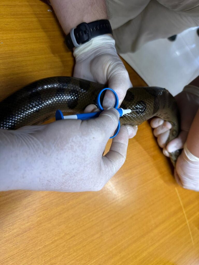 Profesionales de la División de Áreas Protegidas de ITAIPU iniciaron la colocación de microchips para identificar de manera individual a ejemplares de mbói jagua (Eunectes murinus) en el Refugio Biológico de Mbaracayú. Esta especie es uno de los objetos de conservación de la mencionada área protegida, de gestión binacional.