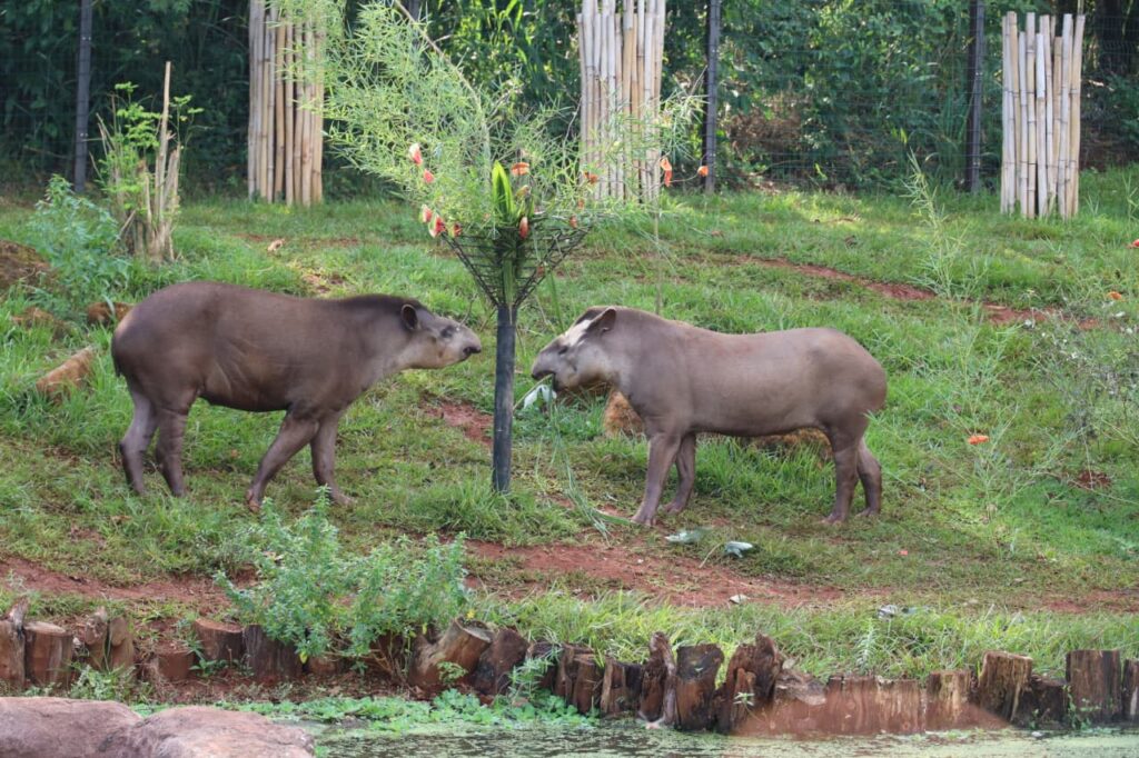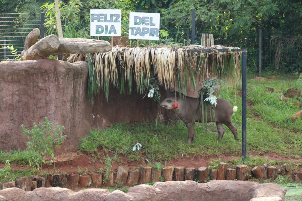 El encuentro tuvo lugar en el hábitat de humedales, el espacio que habitan los tapires dentro del sendero, ubicado en el Centro Ambiental Tekotopa de la Binacional (Hernandarias). Durante la actividad, el público tuvo la oportunidad de ver de cerca a dos ejemplares de esta especie, mientras disfrutaban del enriquecimiento ambiental preparado por los especialistas del Centro de Investigación de Animales Silvestres (CIASI) de la Entidad.