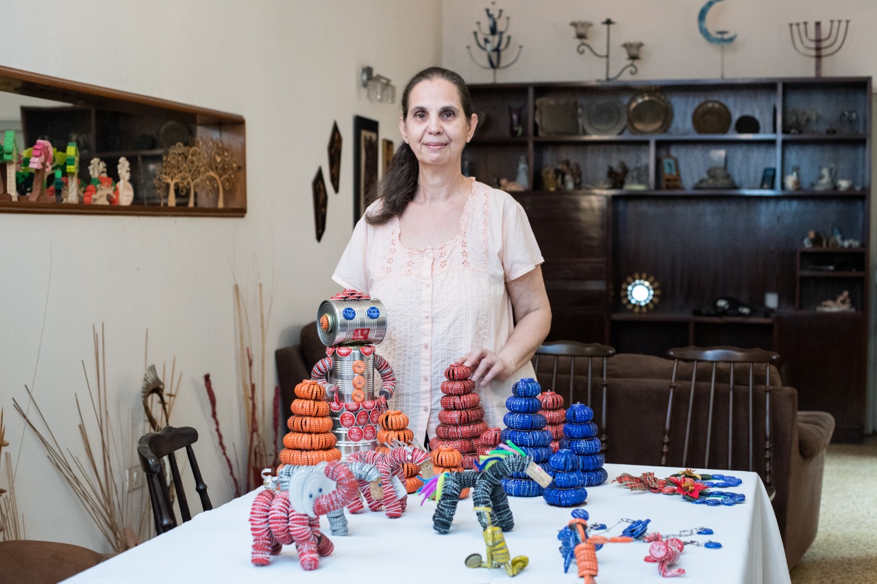 Lucia Vidal, de 68 años, es otra de las mujeres que se encuentra ofertando sus productos en la feria, también oriunda de Asunción, es especializada en la elaboración de productos como muñecos, robots y adornos a partir de la reutilización de tapitas metálicas, latas, frascos y hasta corchos. Recibe pedidos de estos objetos al (0981) 497 789.