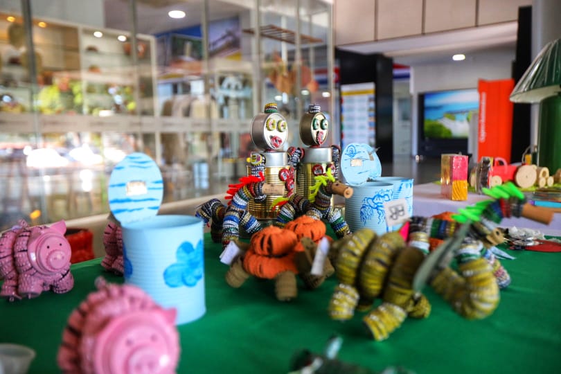 La exhibición de artesanía del reciclaje que se realiza bajo el lema “ITAIPU Recicla” en el Centro de Recepción de Visitas (CRV) de ITAIPU Binacional prosigue hasta este domingo 29 de mayo. En la feria se pueden apreciar diferentes artículos realizados a partir de telas, metales, plásticos y vidrios reutilizados.