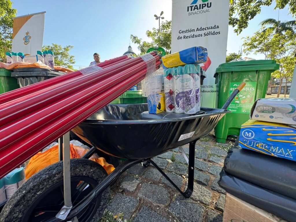 Asimismo, en la minga se hizo la entrega de insumos y materiales de limpieza para la gestión adecuada de residuos a las autoridades locales. El lote suministrado por ITAIPU incluye basureros diferenciados, bolsas, rastrillos, carretillas, repelentes, guantes, entre otros elementos.