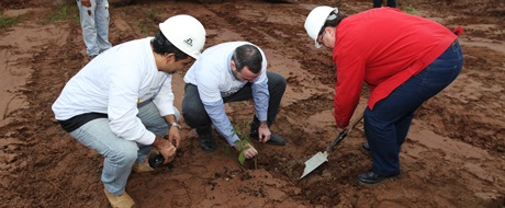Pese a la inclemencia del tiempo, autoridades, representantes de empresas contratistas y obreros, que trabajan en el proyecto San Francisco, se metieron de lleno para realizar la primera muda de plantines de especies nativas, en lo que será el próximo “Parque de los obreros”. El área verde bordeará uno de los linderos del predio de 23 hectáreas.