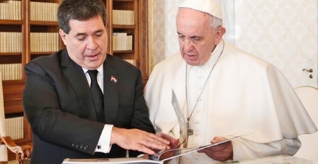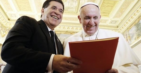 El Papa Francisco animó al presidente de la República, Horacio Cartes, a seguir trabajando por los más pobres y a continuar con la lucha contra la corrupción. Fue al tiempo de recibir del jefe de Estado paraguayo un informe completo, con material fotográfico, del avance de la construcción del barrio San Francisco, en Zeballos Cué, impulsada por el Gobierno Nacional tras la visita del Papa Francisco a la zona del bañado.