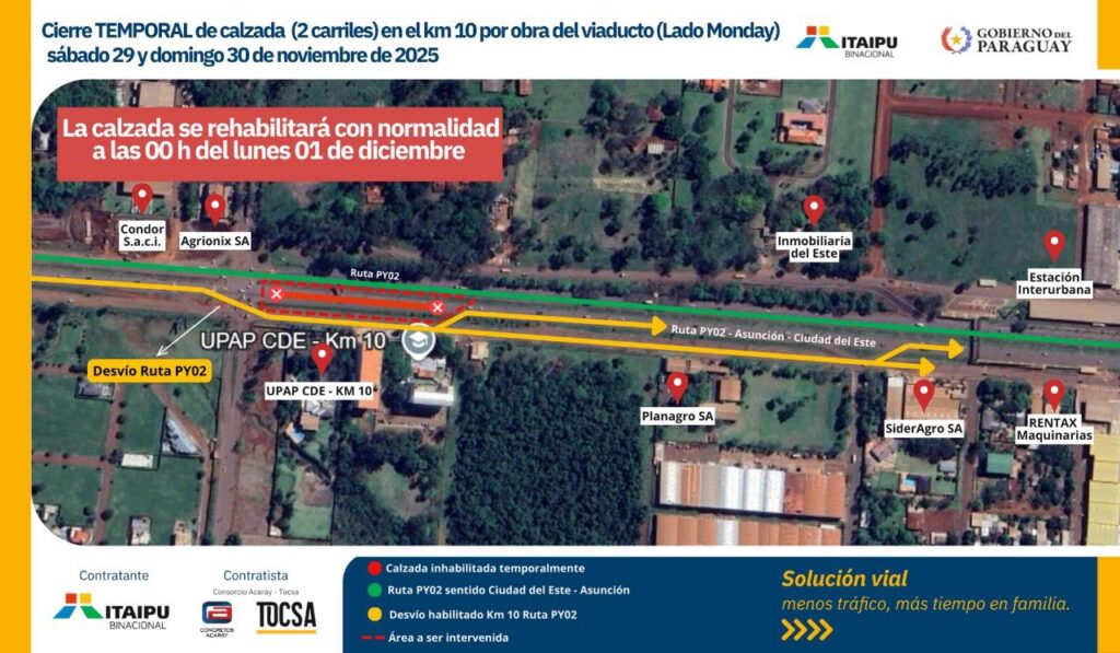 Para este fin de semana se prevé nuevamente el cierre parcial y temporal de la ruta PY02, a la altura del kilómetro 10 de Ciudad del Este, en el marco de los trabajos de construcción del futuro viaducto en esta intersección que financia ITAIPU. Se trata de la calzada sur (lado Monday) sentido Asunción – CDE, que será bloqueado desde las 00:00 del sábado 29 de noviembre.