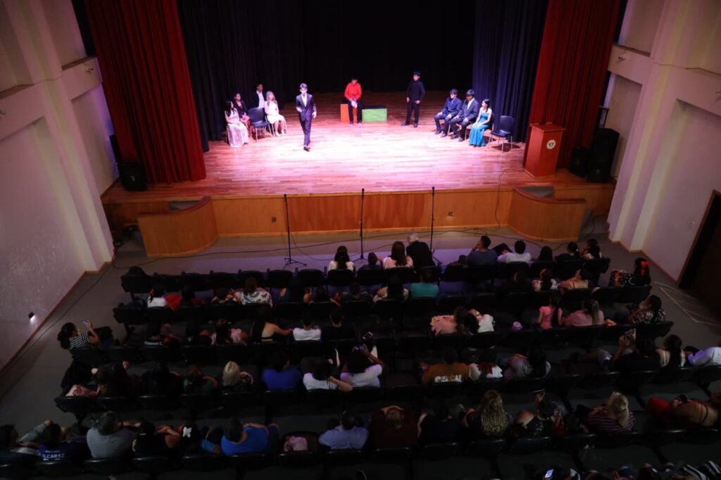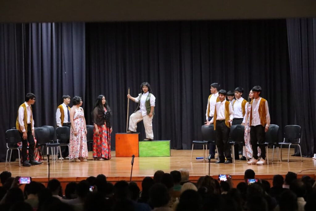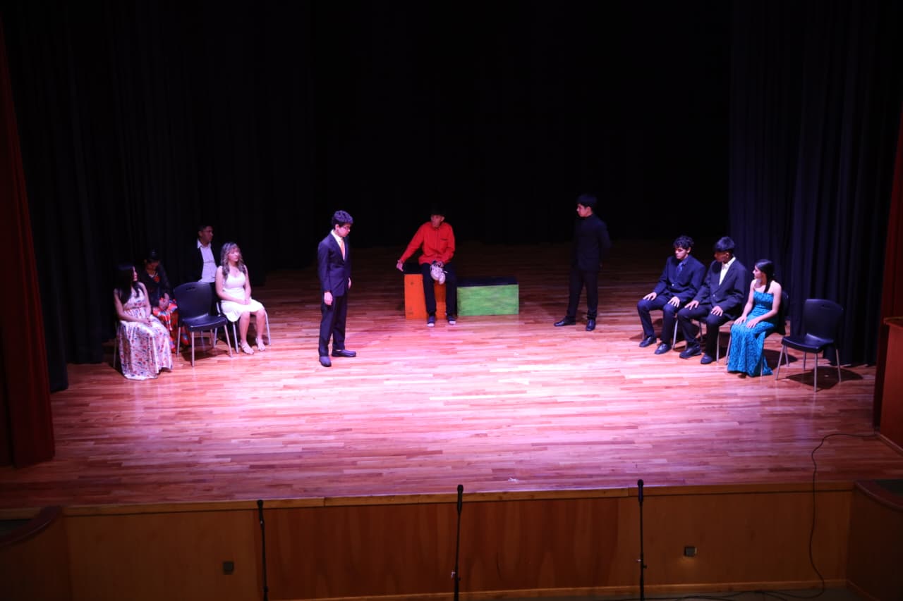 En el inicio, se presentó la obra teatral «La excepción y la regla» de Bertolt Brecht, que explora las dinámicas de poder y la moralidad en el contexto del capitalismo. Posteriormente, subió a escena la obra «Esperando a Godot» de Samuel Beckett, que cuenta la historia de dos hombres que mantienen conversaciones absurdas y reflexionan sobre la vida, la existencia y la esperanza; mientras se enfrentan a la incertidumbre y la monotonía del tiempo. Ambas obras estuvieron a cargo de alumnos del primero y segundo cursos del Nivel Medio del colegio.