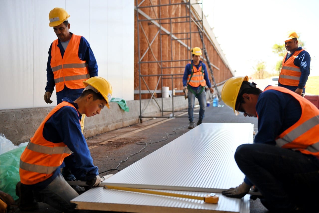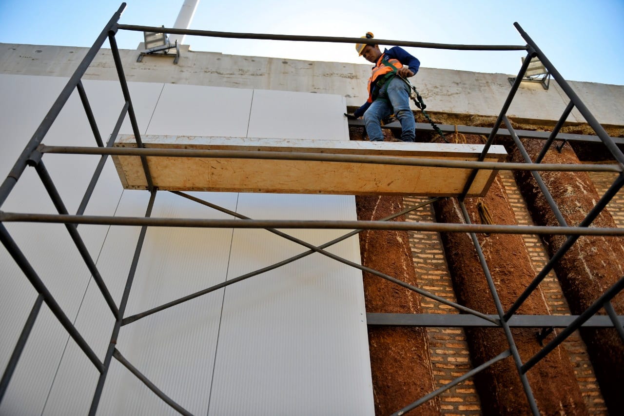 Las tareas de montaje de revestimientos de las pantallas de pilotes del Multiviaducto Km 7 de Ciudad del Este, financiado y ejecutado por ITAIPU, avanzan sin contratiempos y ya muestran un importante cambio en el paisaje de la zona. Se trata de cerramientos verticales, tipo paneles metálicos estructurados, sobre soportes incrustados en el hormigón, a modo de recubrimiento.