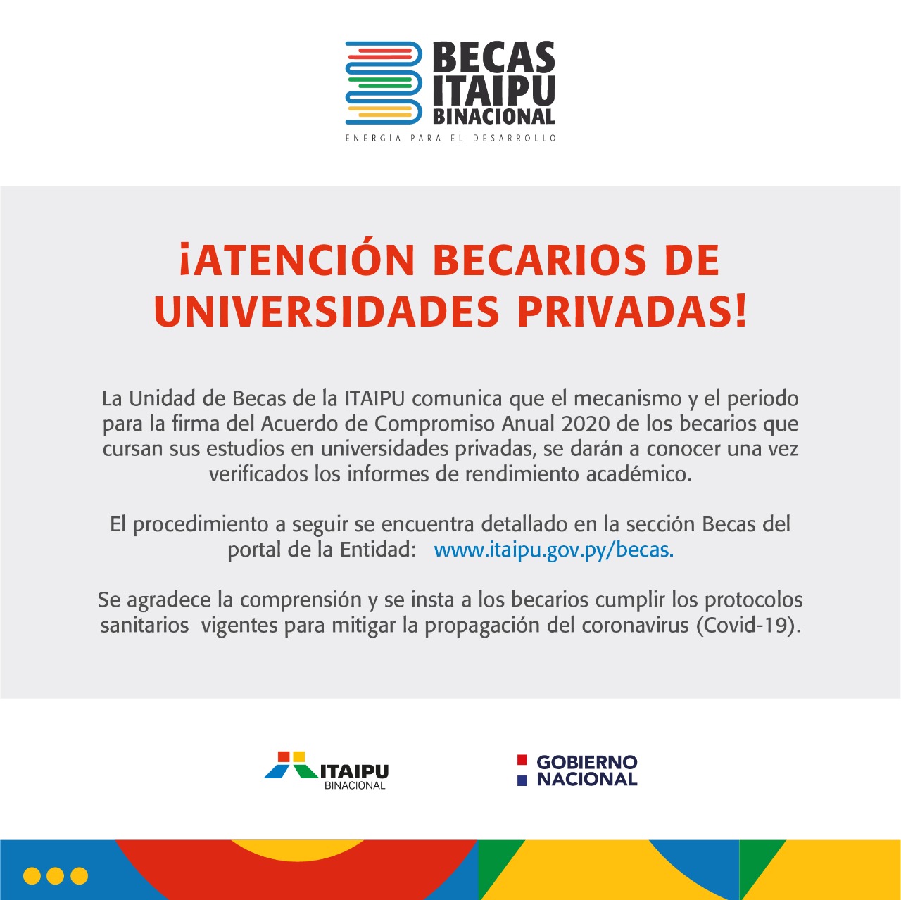 La Unidad de Becas de la ITAIPU Binacional comunica que se encuentra en el proceso de verificación de los informes de rendimiento académico para la Firma del Acuerdo de Compromiso Anual 2020 de los becarios que cursan sus estudios en instituciones privadas. Los estudiantes recibirán un correo electrónico o comunicación telefónica para acudir a las sedes habilitadas a cumplir con este requisito esencial, de forma a seguir con el beneficio de la beca de ITAIPU.
