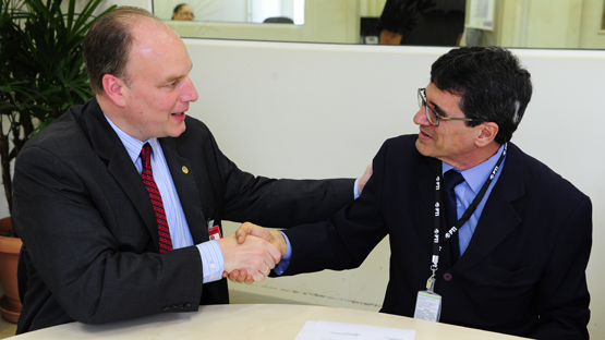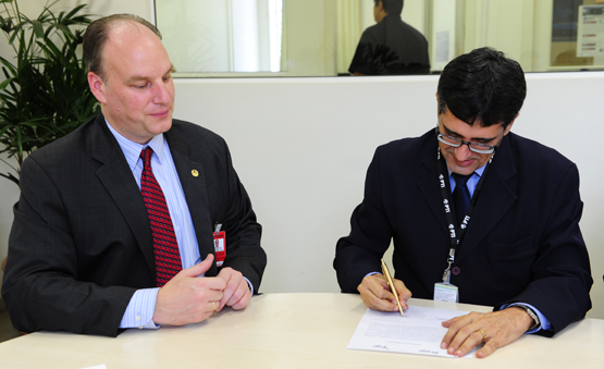 Los doctores Spalding y Dos Passos Subrinho firman el acta de entendimiento, que abre la posibilidad de más becas para jóvenes paraguayos.