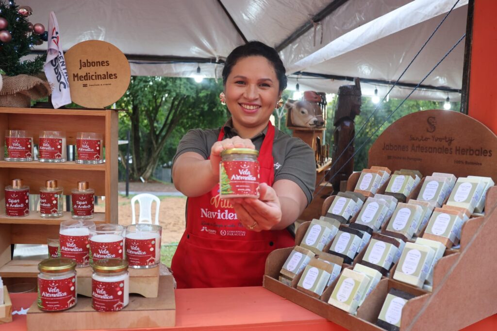 Entre los artesanos participantes en la feria se destaca Nilsa Cáceres, del emprendimiento Santo Yvoty, dedicado a la elaboración de cosmética natural. Su propuesta incluye jabones medicinales, velas artesanales aromáticas aptas para masajes, difusores con fragancias aceitosas de larga duración y productos elaborados con sándalo y flor de coco, especialmente pensados para la temporada navideña.