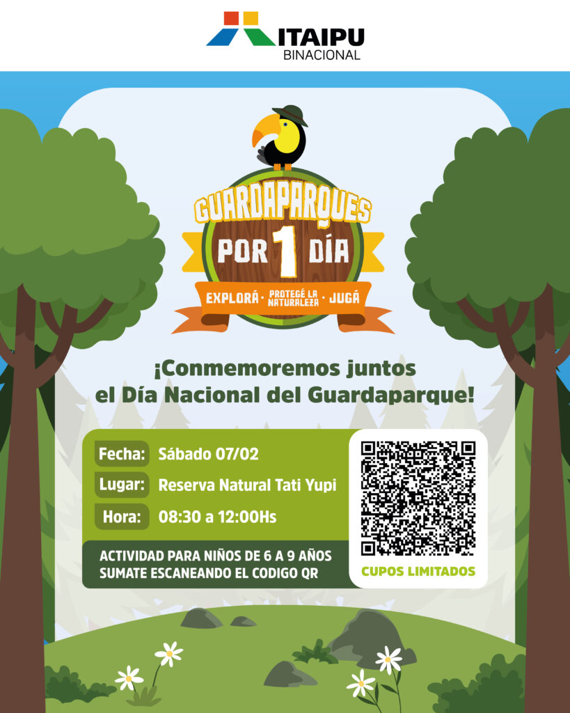 ITAIPU, a través de la División de Educación Ambiental, invita al encuentro “Guardaparques por un día”, iniciativa orientada a que niños de 6 a 9 años conozcan la labor de los profesionales que ejercen la tarea de defensa de la naturaleza. La convocatoria tendrá lugar mañana sábado, 7 de febrero, en la Reserva Natural Tatí Yupí (Hernandarias), en el marco de la conmemoración del Día Nacional del Guardaparques.